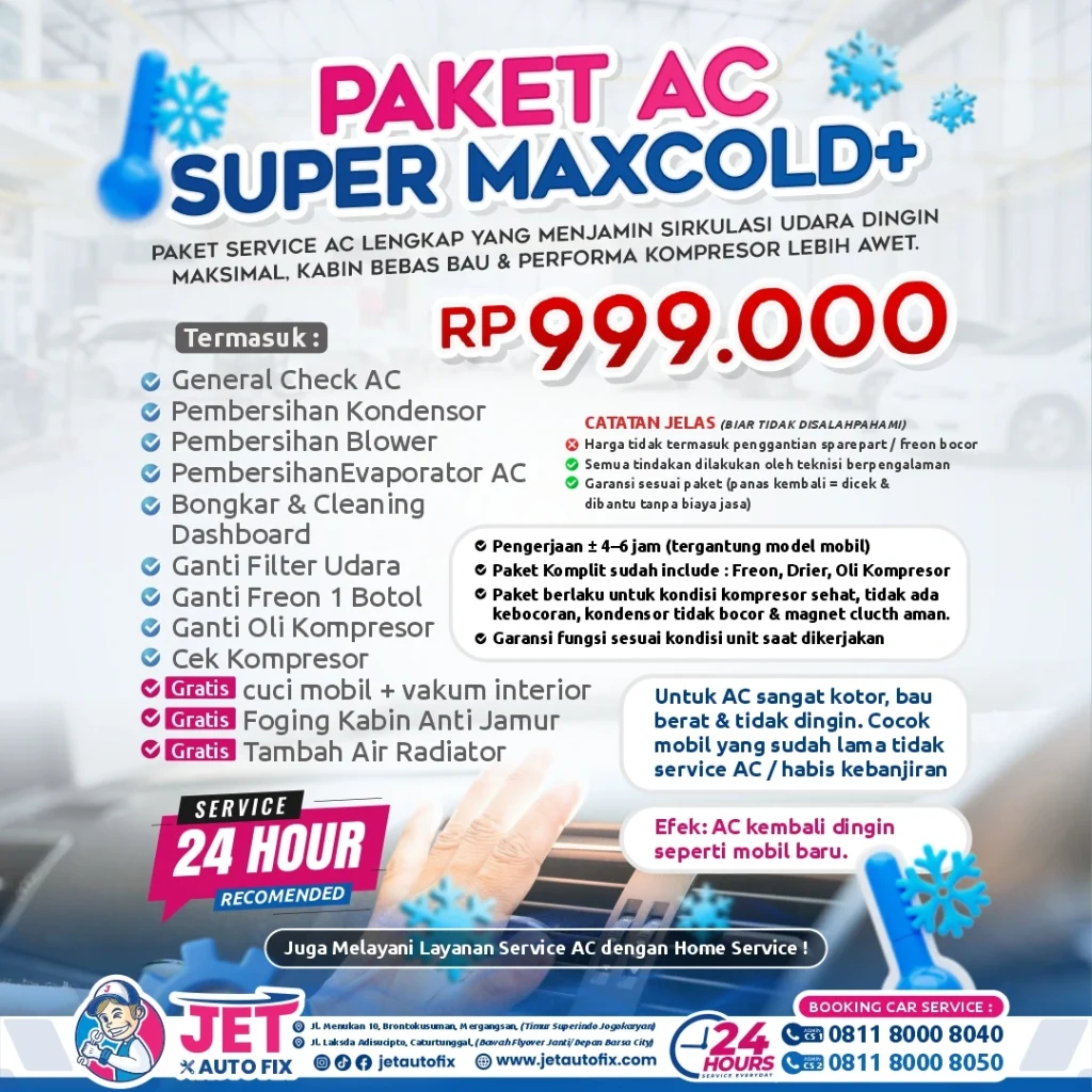 AC mobil gerah & bau apek? Ke Jet Auto Fix aja! Paket AC Super Maxcold+ hanya Rp 999rb. Cleaning total, isi freon, hingga fogging kabin. Dinginnya juara!