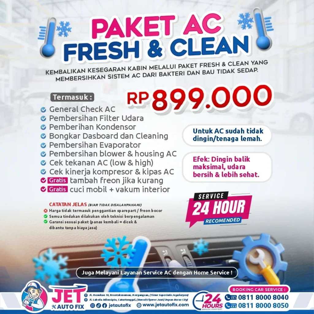 Jangan biarkan debu dan jamur menumpuk di sistem pendingin mobil Anda. Di Jet Auto Fix, kami menyediakan Paket Fresh & Clean seharga Rp 899.000. Paket ini merupakan solusi komplit yang memastikan setiap sudut saluran AC kembali bersih dan steril. Apa saja yang dikerjakan dalam paket ini?